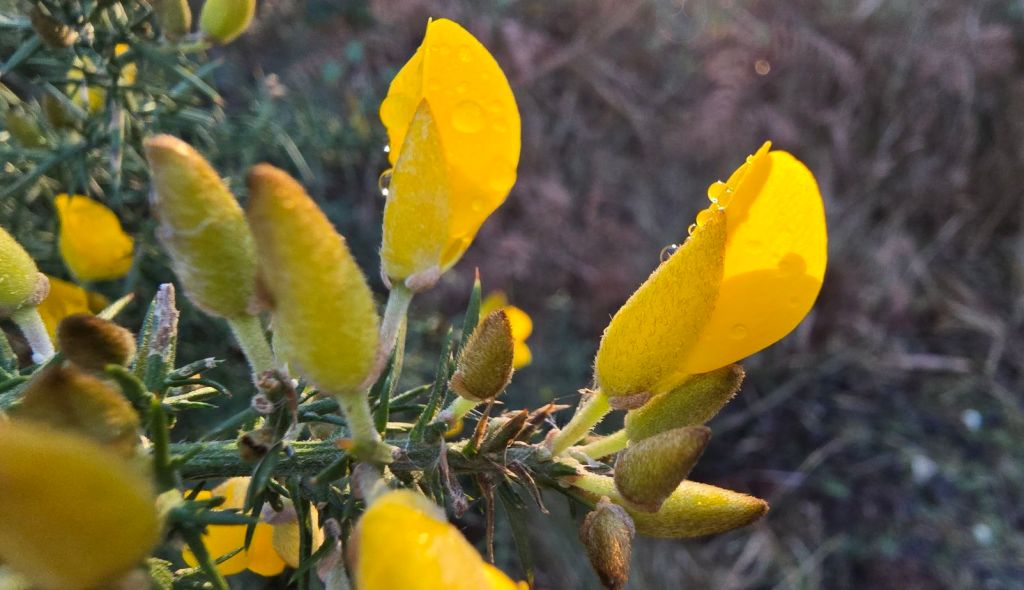 Honeysuckle and willow have started to sprout fresh green leaves, adding another layer of colour to the winter’s browns, greys and misty whites. Alder buds are purple and downy looking. Gorse adds pops of yellow, dew-dropped with rain.