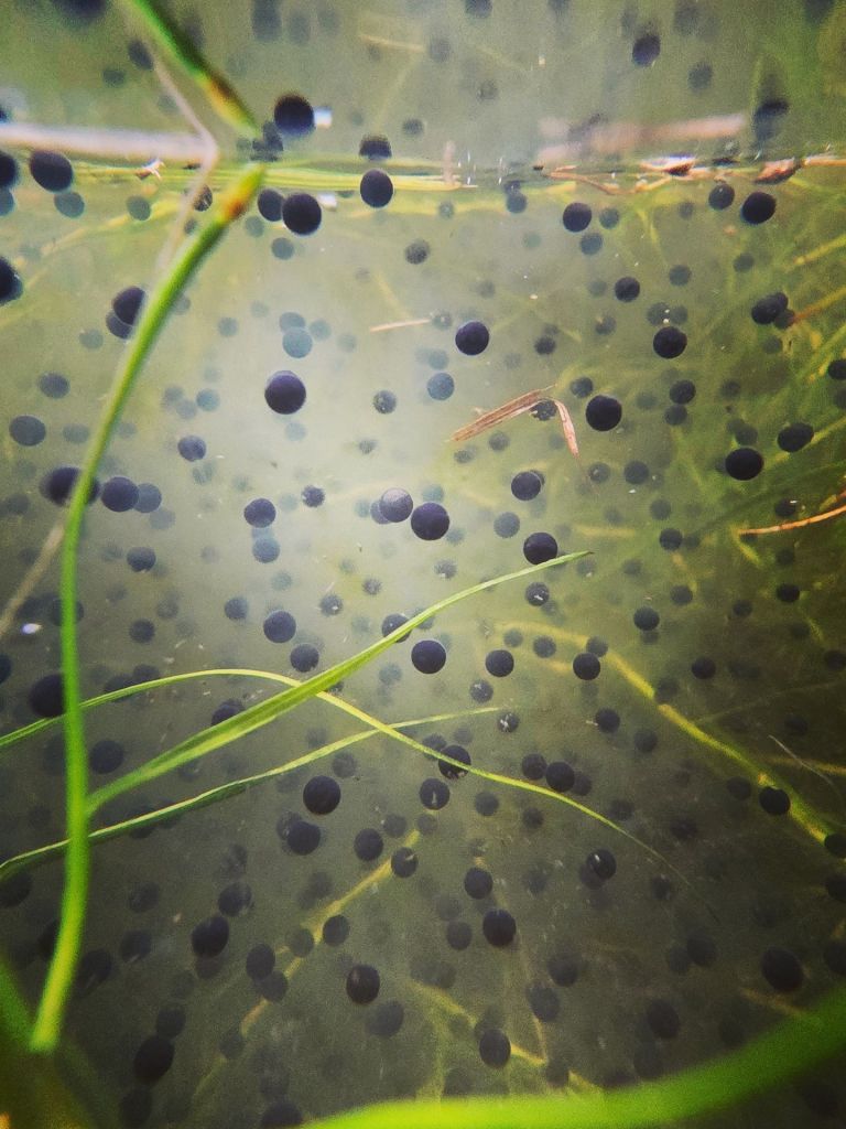 Frogspawn has arrived, like mysterious little dark aliens suspended in shimmering gelatinous pools, changing shape rapidly from dots to kidney beans. Mornings and evenings when the light is dull there is always the chance of seeing the periscope-eyes of those amphibians who lad them watching you cautiously from the water’s surface.